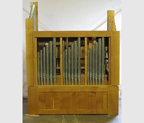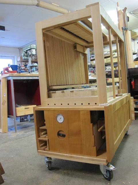 Das Untergehäuse ist fertig, enthaltend die 6 tiefsten Töne von Gedackt 8' sowie Gebläse und Balg. Letzterer ist von 50 bis 80 mm WS im Druck regelbar. Wir sind gespannt auf diese neuartige Möglichkeit, das Instrument unterschiedlichen Raumgrößen bzw- Lautstärkeerfordernissen anpassen zu können. Natürlich setzt eine Druckänderung eine Nachstimmung voraus, sie kann also nicht innerhalb einer Veranstaltung durchgeführt werden.